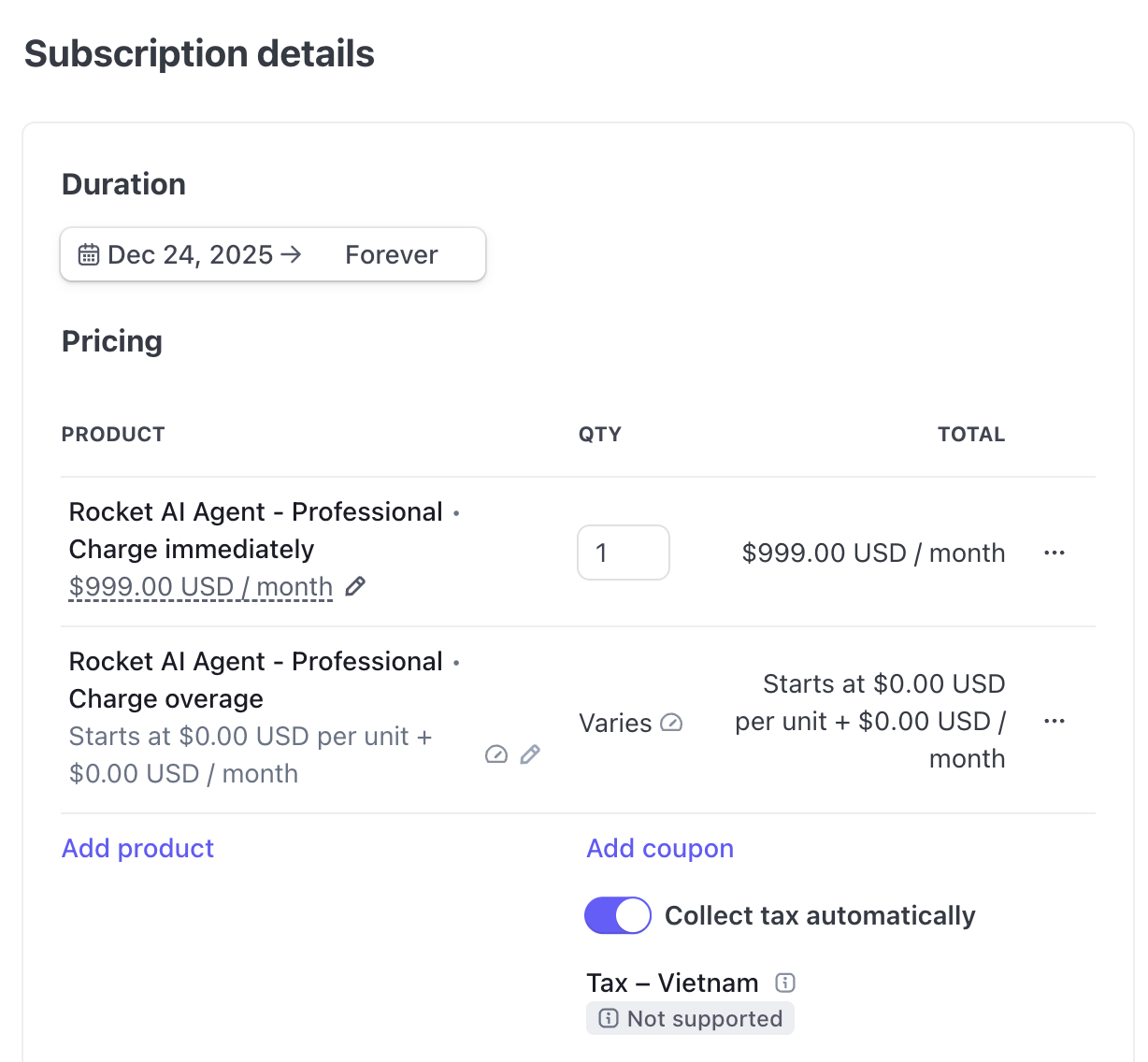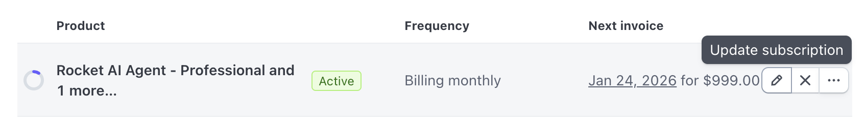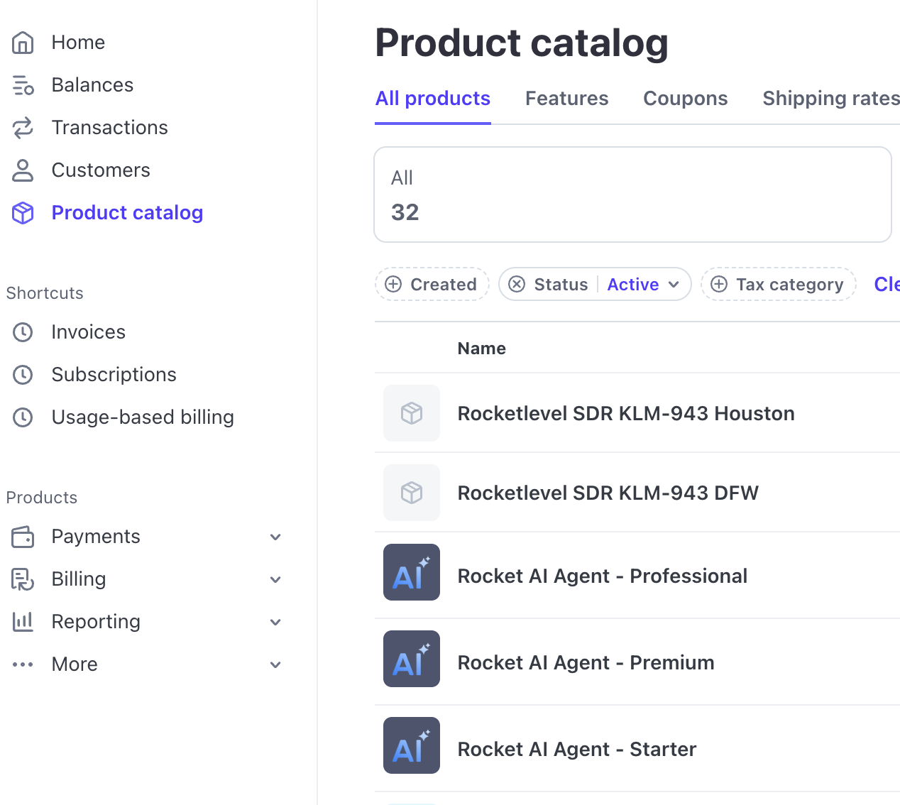 Section titled “How the AI Agent Subscription works”Currently, on Stripe, there are 3 products for Rocket AI Agent: