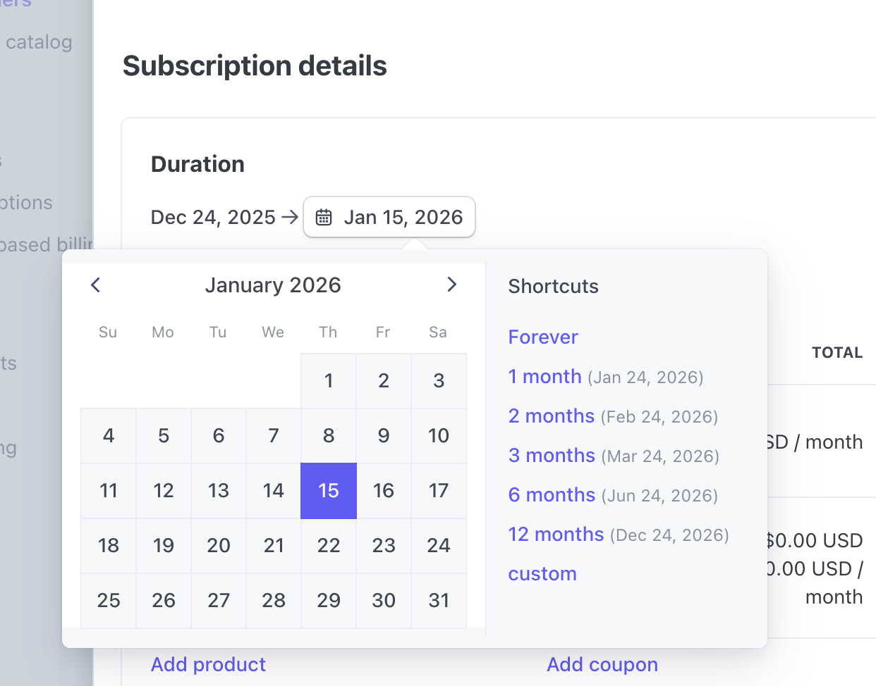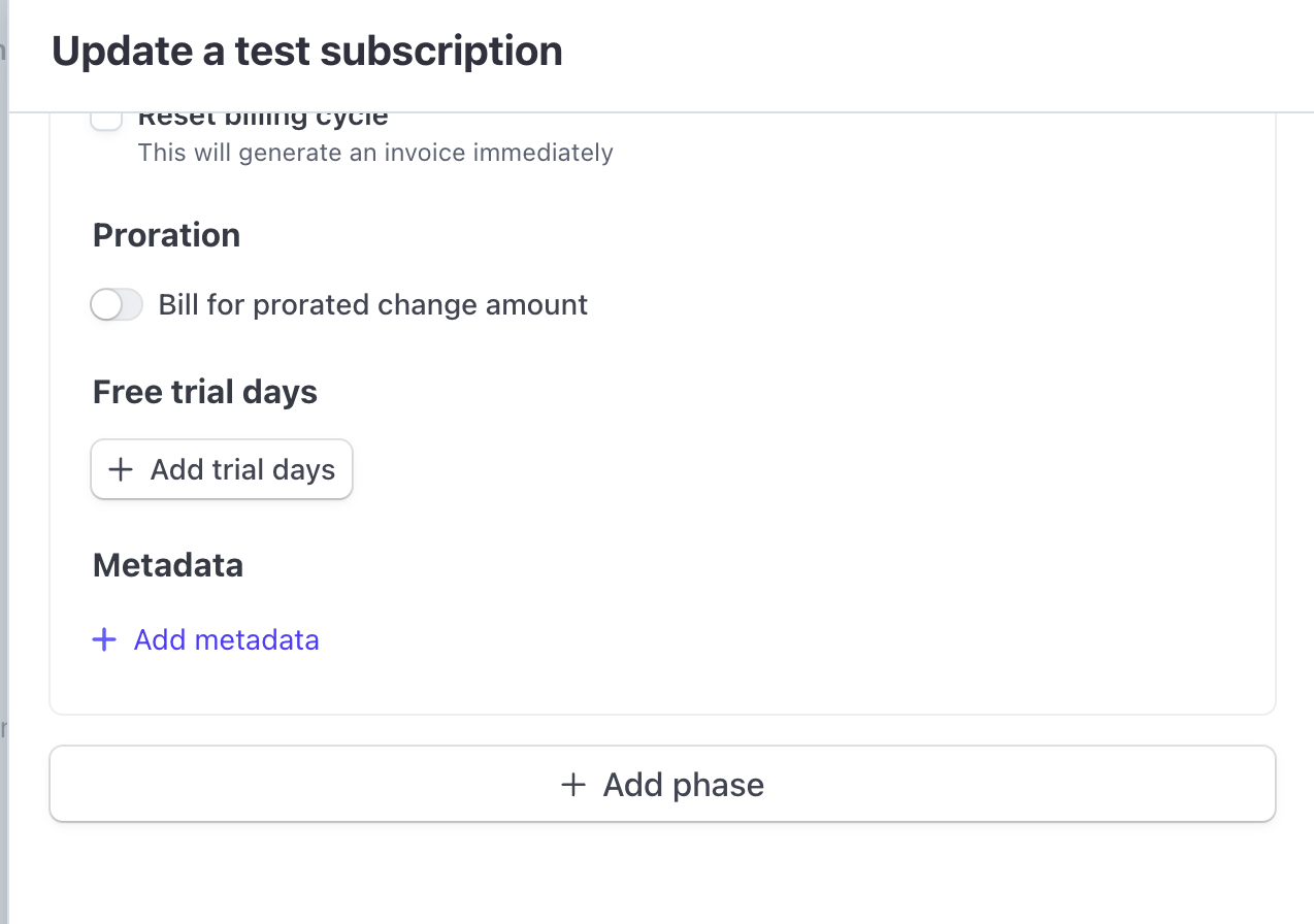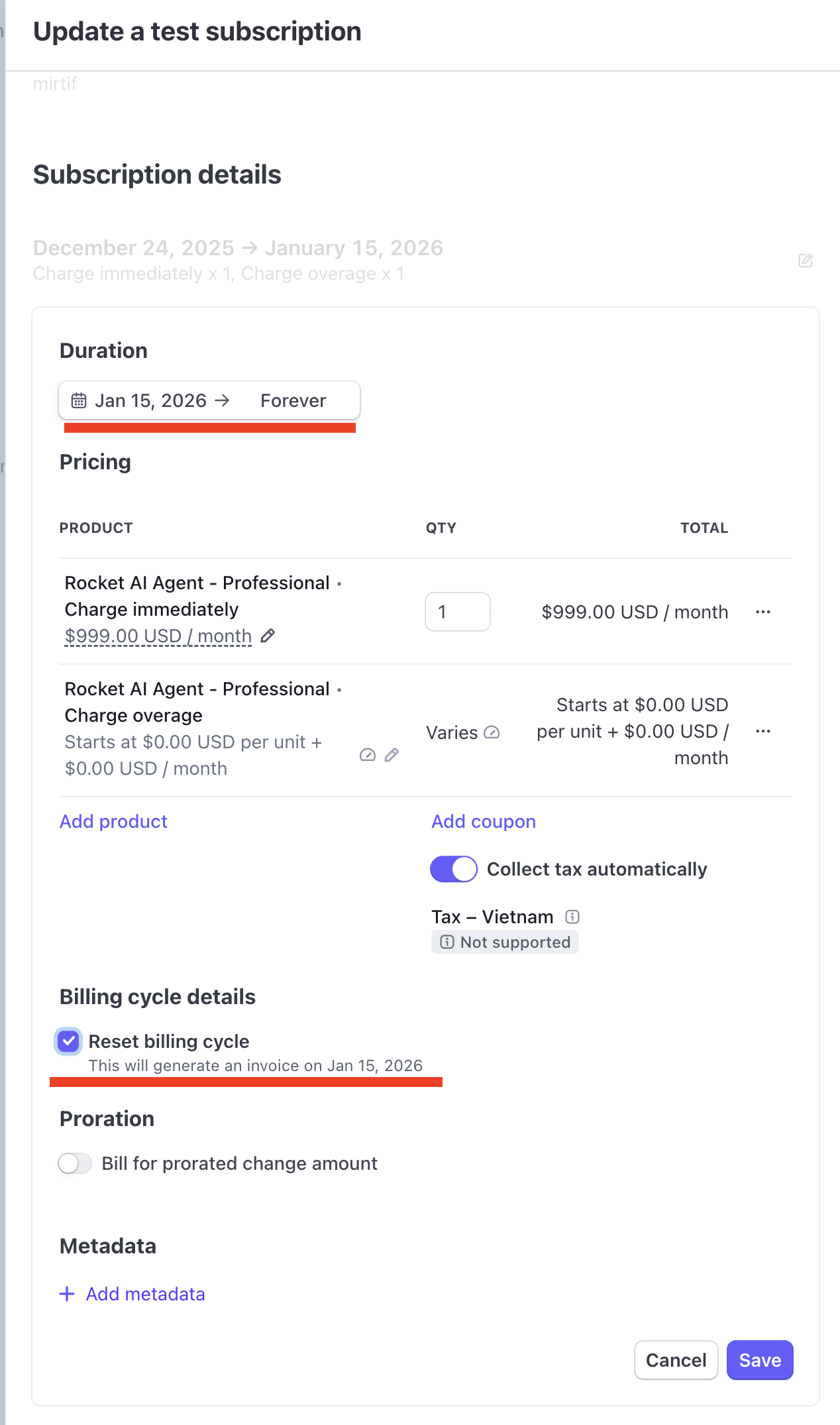 On the next phase, set the Duration as below and check the box Reset Billing cycle. Click Update Subscription to finish.