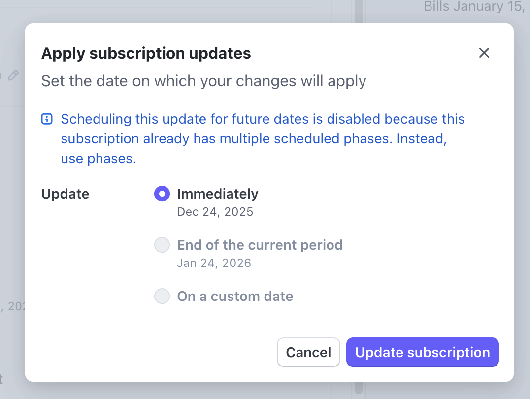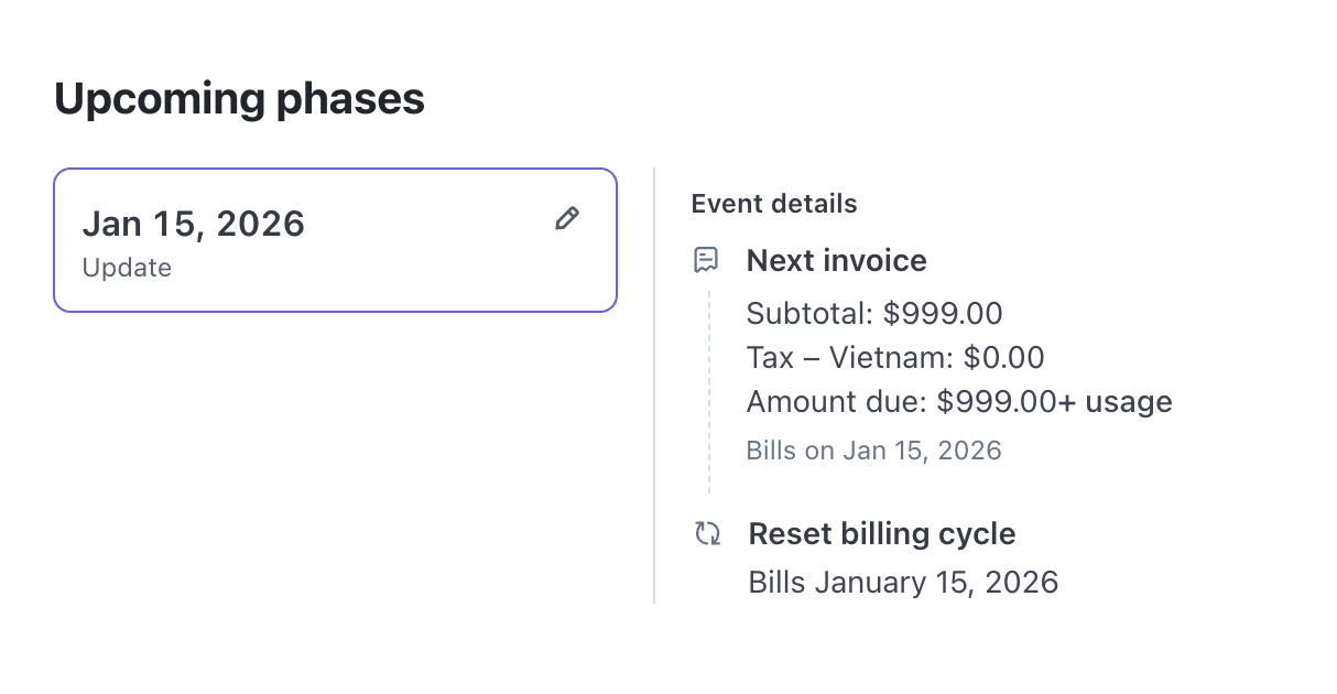 Section titled “Step 4: Double-check”Once the subscription is updated successfully, click it to open the detail page and see if the phases and billing cycles are displayed as expected.