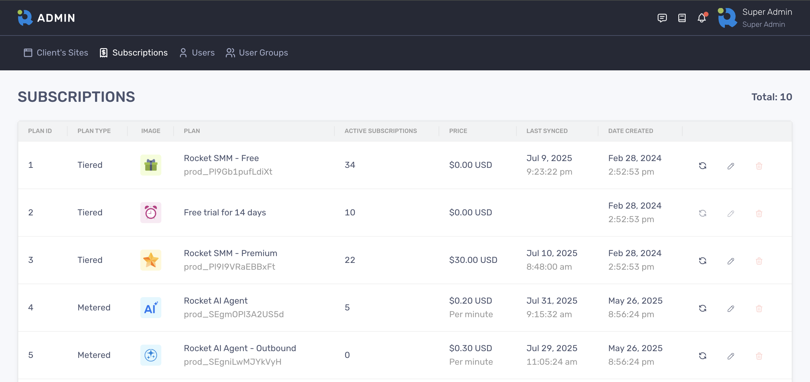 Section titled “View the subscriptions”All the current subscriptions on RocketLevel are synced directly from Stripe. Any new one should be added from Stripe.