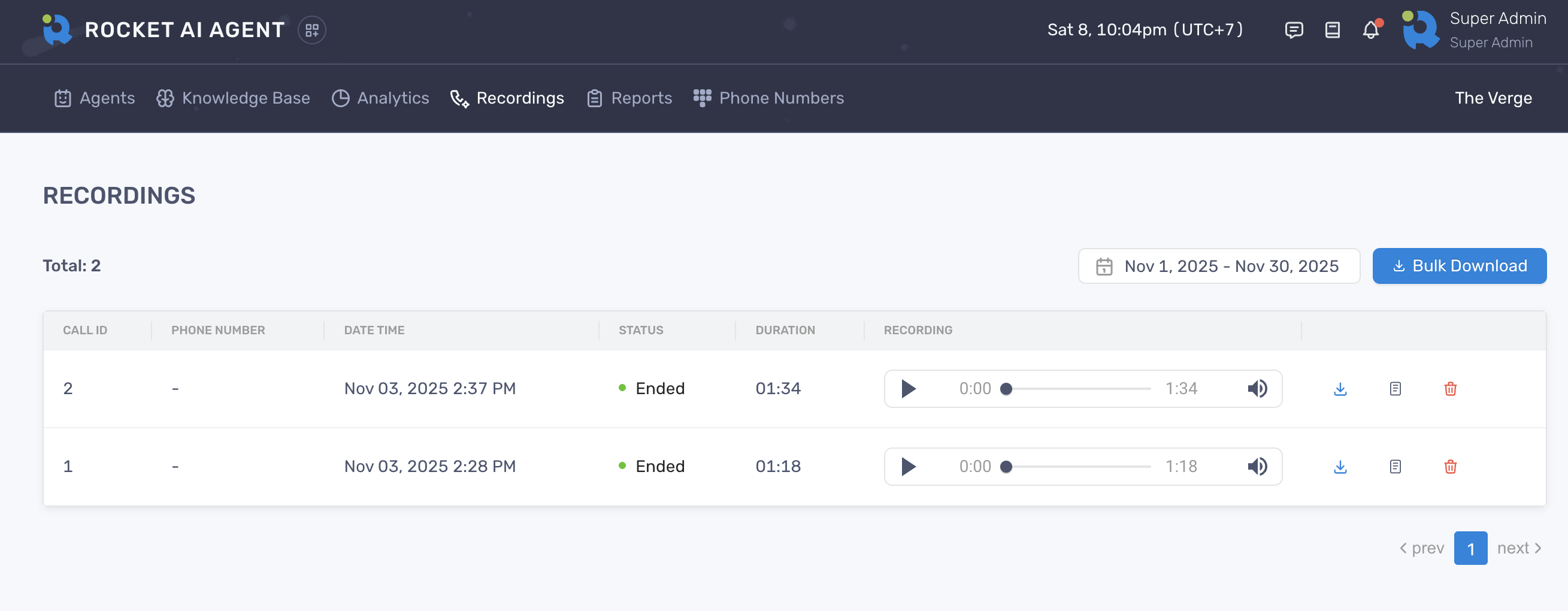 Section titled “Overview”The Recordings tab provides a comprehensive view of all your calls and their statuses. On this page, you can: