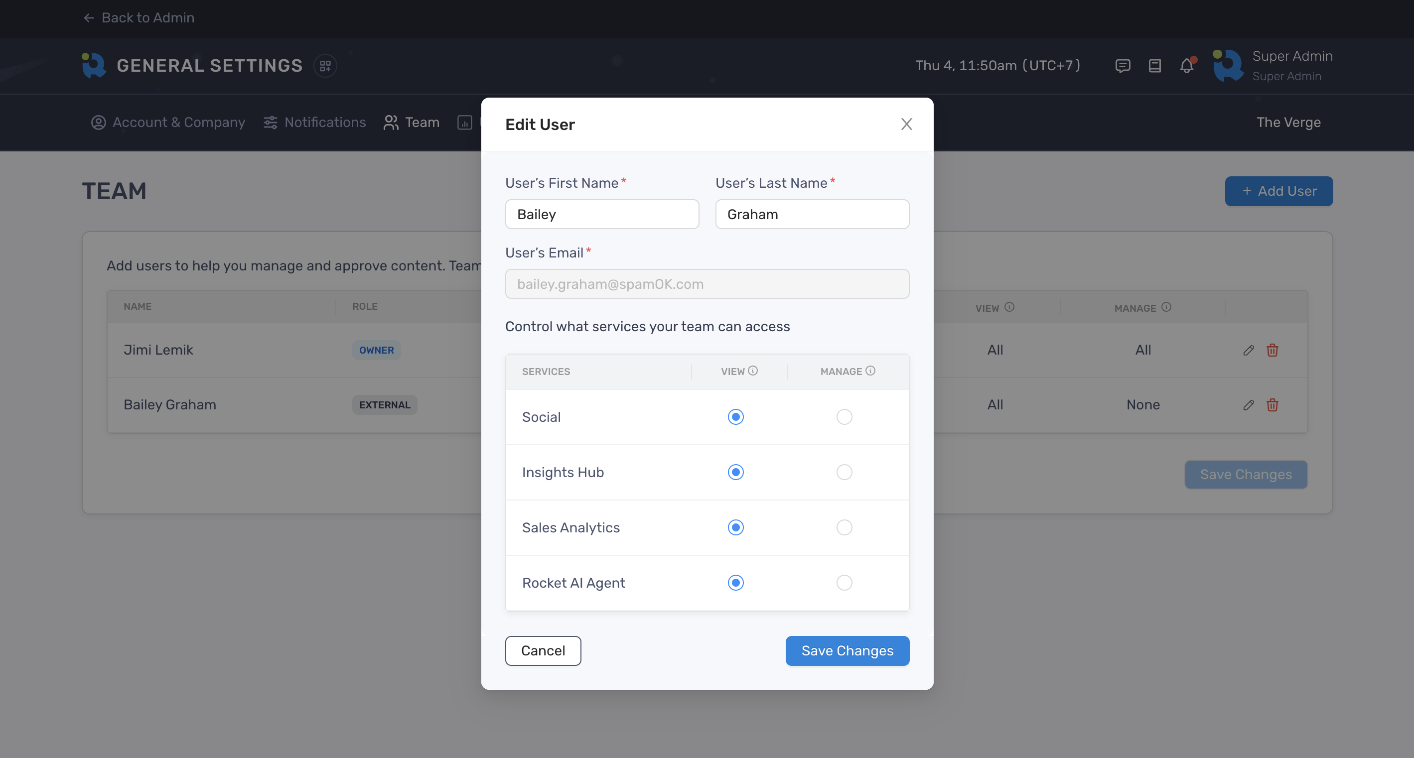 Section titled “Edit the team member’s permissions”- Locate the Team section on the General Settings page